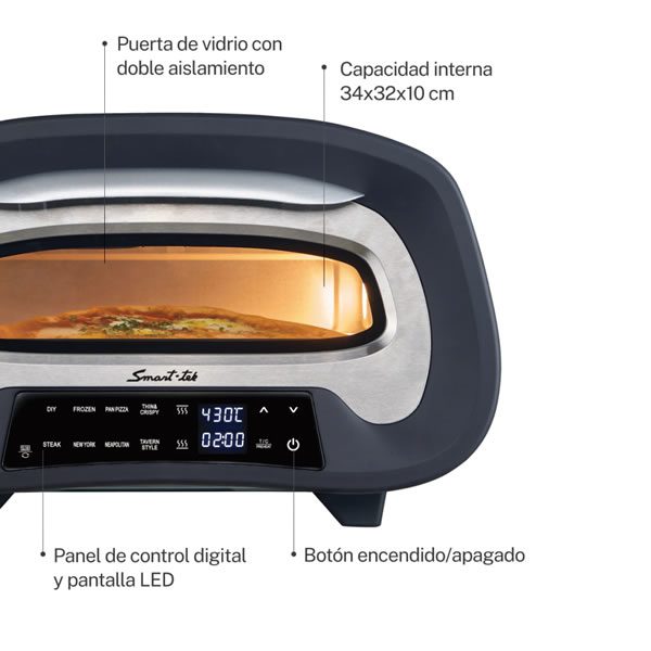 - Temperatura ajustable: Rango de 80°C a 430°C, ideal para adaptarse a todo tipo de recetas, desde pizzas hasta filetes.