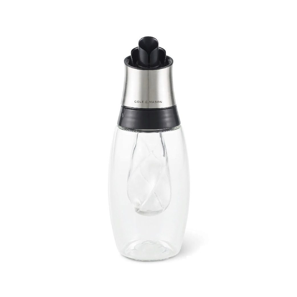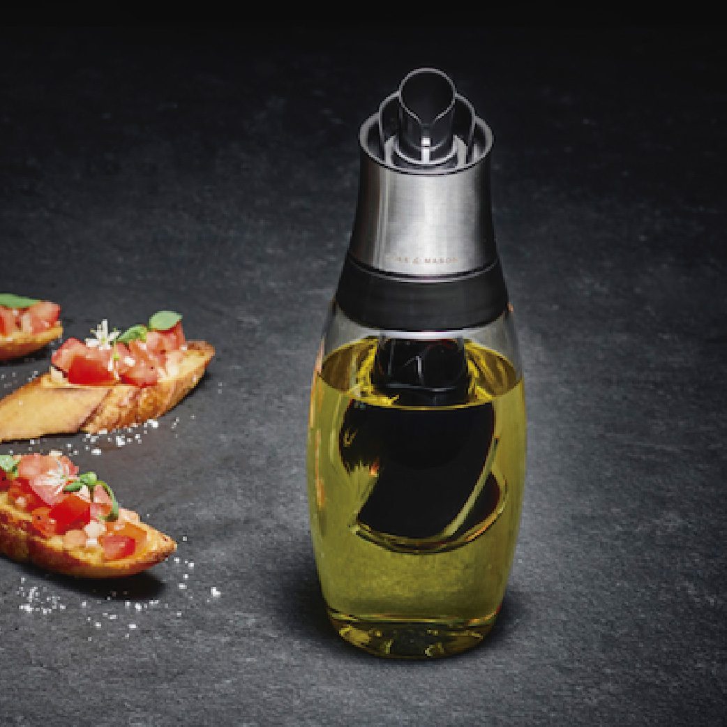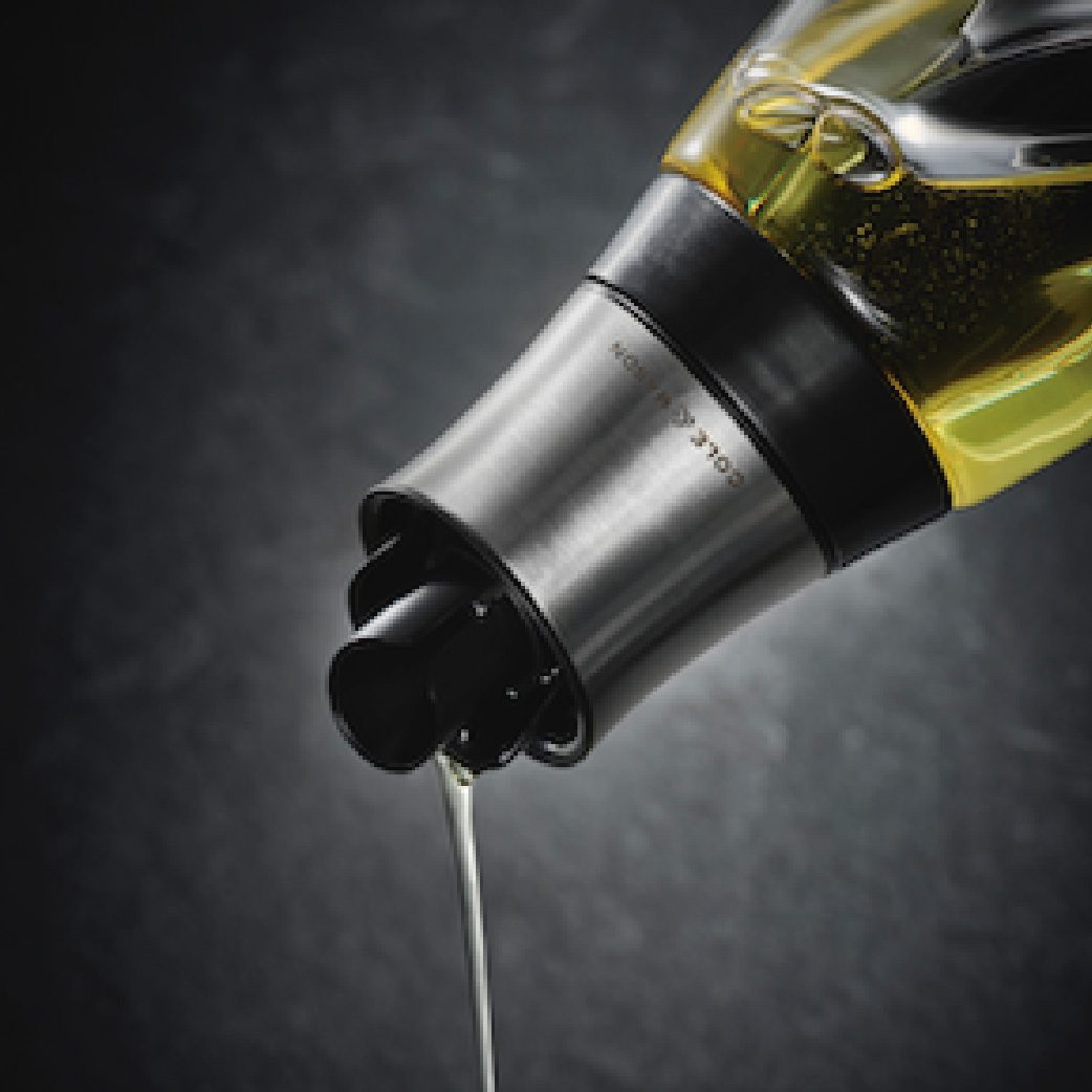 Aceitero y vinagrero duo con tapa de acero inoxidable que gira fácilmente y permite seleccionar entre aceite, vinagre o posición de cerrado. Sistema antigoteo y libre de obstrucciones.