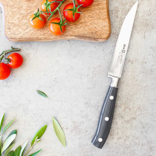 El Cuchillo Tomatero Signature está diseñado especialmente para pelar y cortar tomates y frutas blandas con la máxima precisión. Su hoja microdentada de acero inoxidable alemán forjado permite realizar cortes limpios y sin esfuerzo, evitando que los alimentos se aplasten. Un cuchillo equilibrado, resistente y elegante, ideal para chefs y aficionados exigentes.
