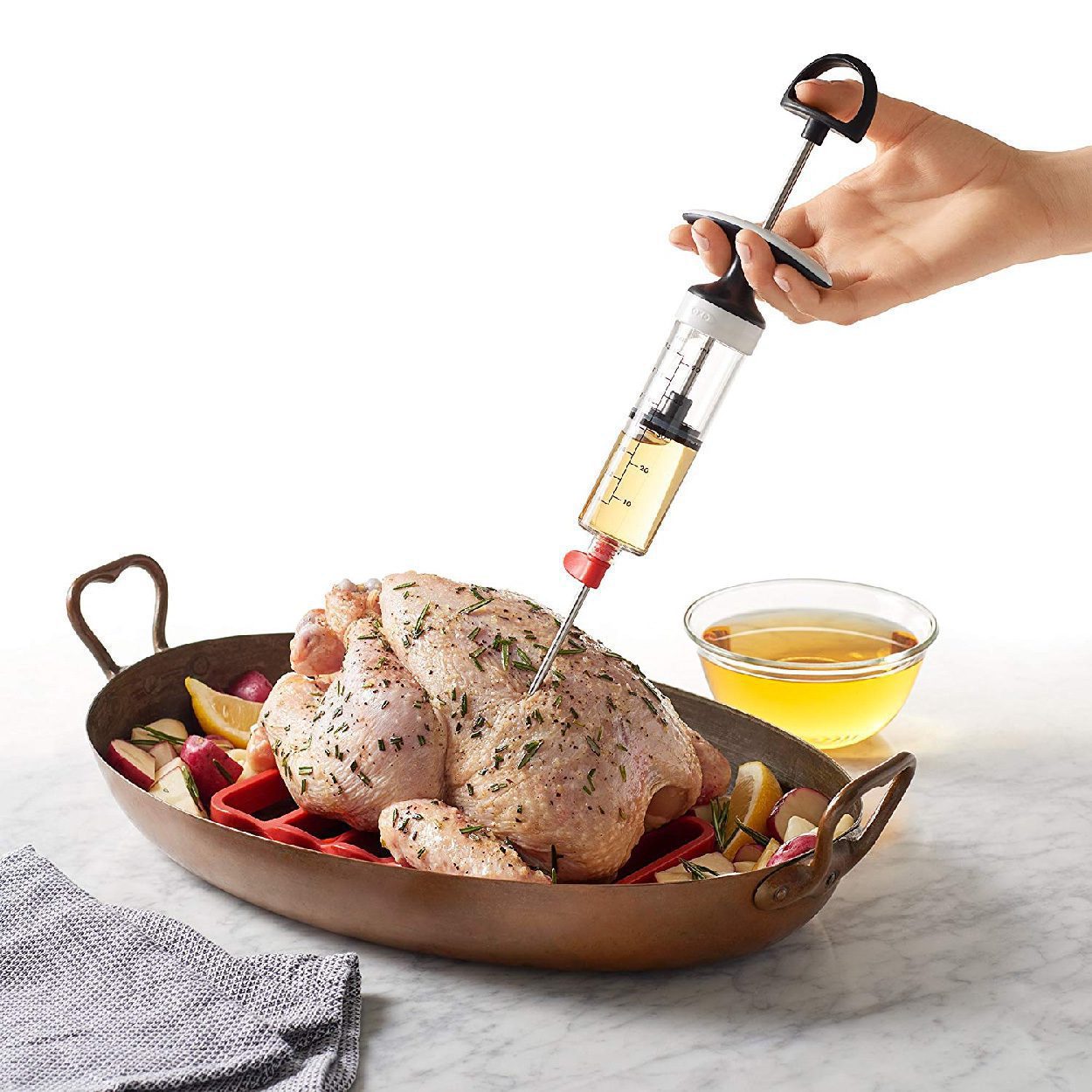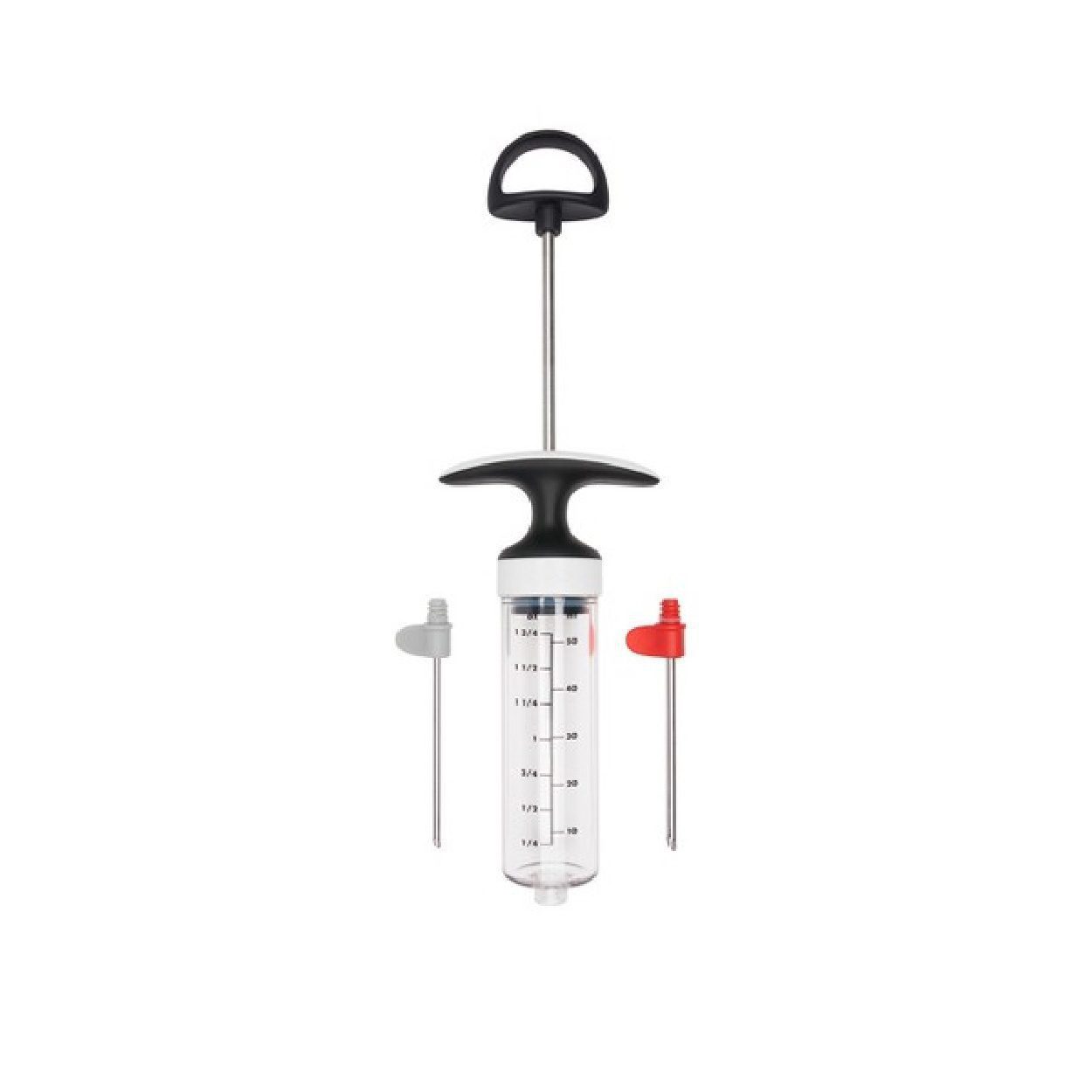 • Inyecta marinadas y otros condimentos en la carne y las aves para obtener un sabor delicioso y jugosidad. • Dos agujas para marinadas gruesas y finas se almacenan dentro del tubo inyector cuando no están en uso. • Las empuñaduras codificadas por colores hacen que las agujas sean fáciles de identificar y torcer • El tubo transparente muestra cómo queda mucho adobo • Marcas de medición de hasta 2 onzas • El mango grande y abierto es cómodo para tirar y empujar •lIBRE DE BPA • Se desmonta para limpiar • Se puede lavar en el lavavajillas