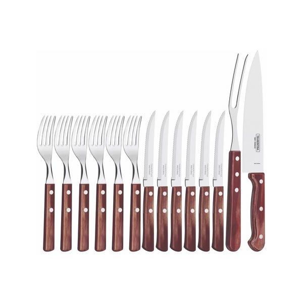 Un juego completo de la línea Churrasco que ofrece cuchillos y tenedores con láminas de acero inoxidable y mangos de madera tratada Polywood resistentes a impactos y altas temperaturas, llevando belleza a la mesa, además de alta calidad y durabilidad.