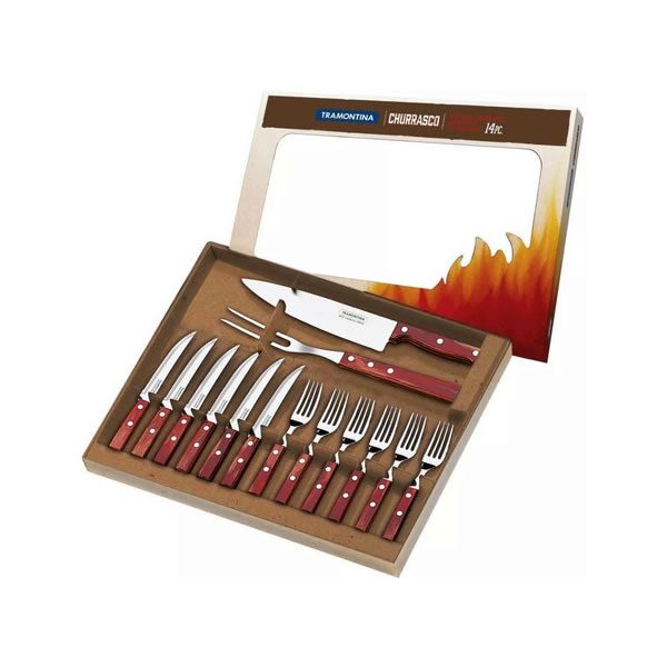 Lúzcase con el asado y con el servicio de mesa con el juego de cubiertos Tramontina de acero inoxidable con mango rojo Polywood, 14 piezas.